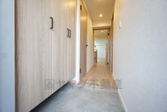 玄関扉を開けると、シンプルなクロスと木の温もりが優しいフローリング、シューズボックス、ダウンライトで明るく清潔感のある空間^^ステキな玄関で帰ってくるのが楽しみになりそうですね^^