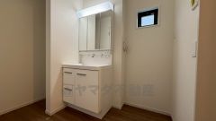 三面鏡裏収納付き洗面化粧台です^^ 歯磨きセットやスキンケア用品などの収納に便利ですね。 生活感も隠すことができ、来客時にも安心です^^