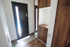 玄関扉にスリットのある明るい玄関です^^たっぷり収納できるシューズボックス付きなので、家族全員の靴がきれいに整頓できます。姿見付きでお出かけ前の身だしなみチェックに便利^^