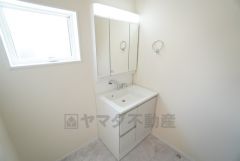すっきり収納できる三面鏡付き洗面台。内側にコンセントがあり大きめの家電も充電しながら収納ができます。レバーシャワーで引き出して使用できます。