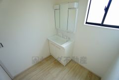 同仕様写真。三面鏡つき洗面台。収納も一体型になっているので、ドライヤーやヘアアイロンの置き場に困りませんね。