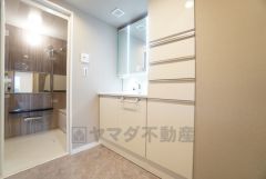 三面鏡裏収納付き洗面化粧台です^^ 歯磨きセットやスキンケア用品などの収納に便利ですね。生活感も隠すことができ、来客時にも安心です。