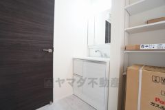 三面鏡裏収納付き洗面化粧台です^^ 歯磨きセットやスキンケア用品などの収納に便利ですね。 洗面台横には可動棚収納付き^^雑然とした洗面室がすっきり片付けやすくなります^^