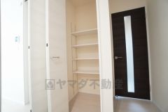 キッチン横に広々としたパントリー付き^^長期保存ができるもの、調理器具、防災グッズを入れておくのもいいですね。洗面室にも近く、食料品だけでなく日用品などの収納にも^^