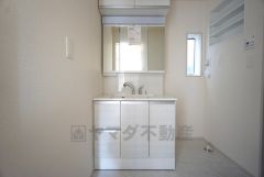 三面鏡裏収納付き洗面化粧台です^^ 歯磨きセットやスキンケア用品などの収納に便利ですね。 生活感も隠すことができ、来客時にも安心です。