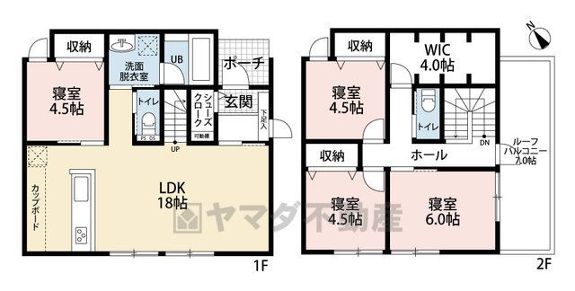 LDK18畳(1F)、洋4.5畳(1F)、洋6畳(2F)、洋4.5畳(2F)、S0畳(2F) |