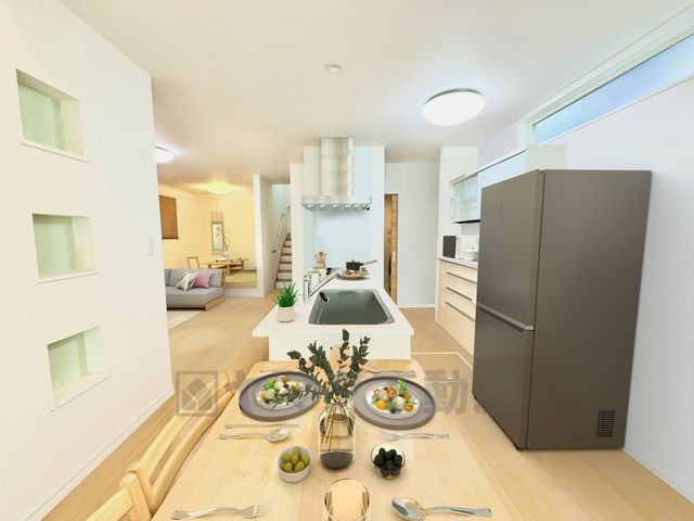 アイランドキッチンなので複数人で調理をしたりするのに便利ですね^^ リビングにいるご家族とコミュニケーションを取りながら家事が楽しめそうです。(インテリアCG画像)