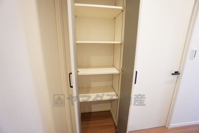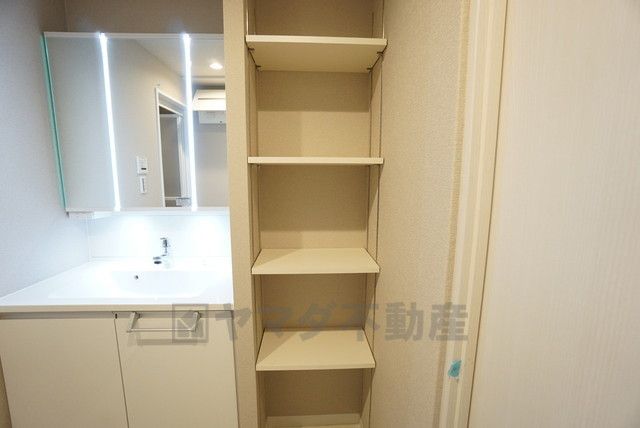 洗面台横には、可動棚タイプの収納スペース完備。衣類やタオルもスッキリ整頓できそうですね^^