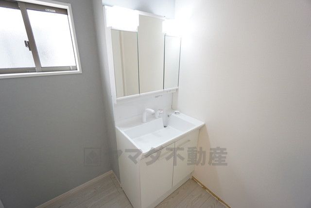 三面鏡裏収納付き洗面化粧台です^^ 歯磨きセットやスキンケア用品などの収納に便利ですね。 ランドリースペース上部には窓も付いており換気に便利です^^