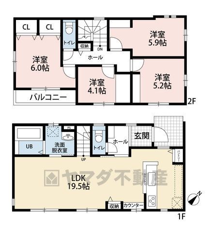LDK19.5畳(1F)、洋6畳(2F)、洋5.9畳(2F)、洋5.2畳(2F)、洋4.1畳(2F) |