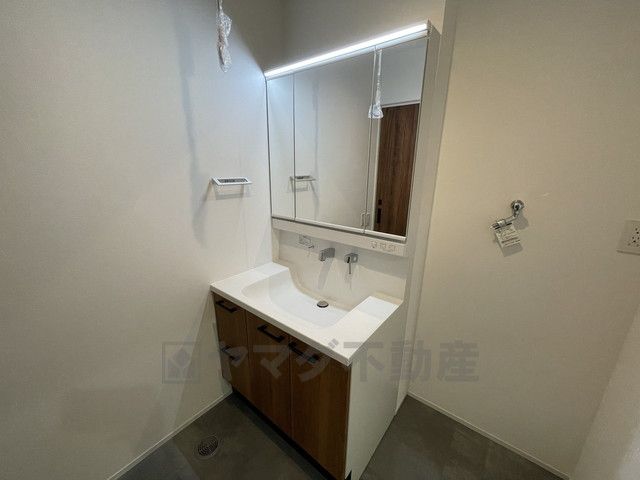三面鏡裏収納付き洗面化粧台です^^ 歯磨きセットやスキンケア用品などの収納に便利ですね。