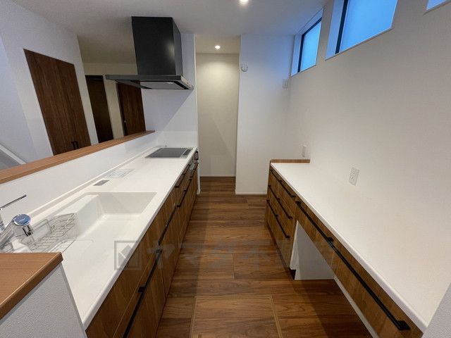 対面式キッチンなのでリビングにいるご家族とコミュニケーションを取りながら洗い物や、お料理が楽しめそうですね^^キッチン後方にはカップボード付きです^^