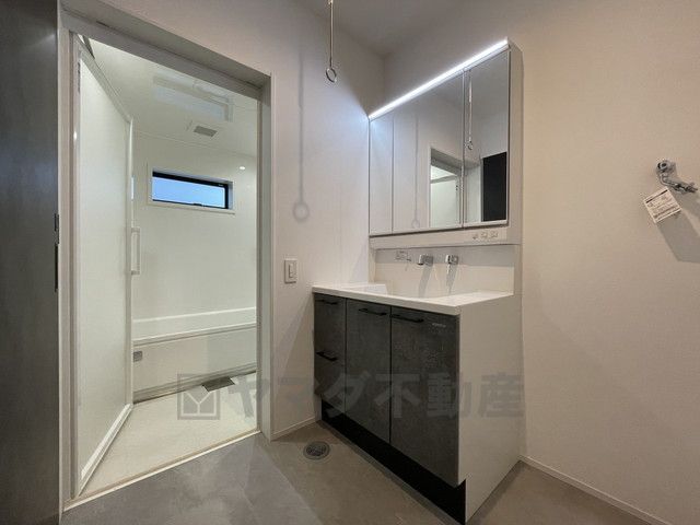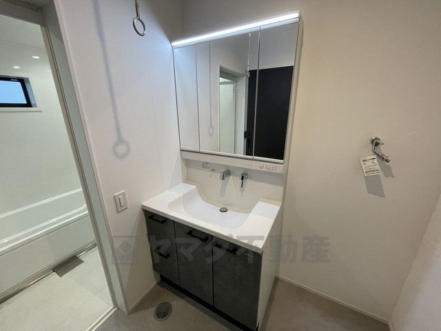 三面鏡裏収納付き洗面化粧台です^^ 歯磨きセットやスキンケア用品などの収納に便利ですね。