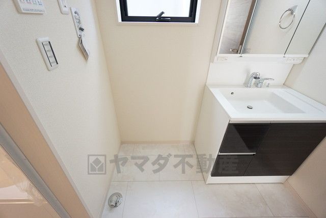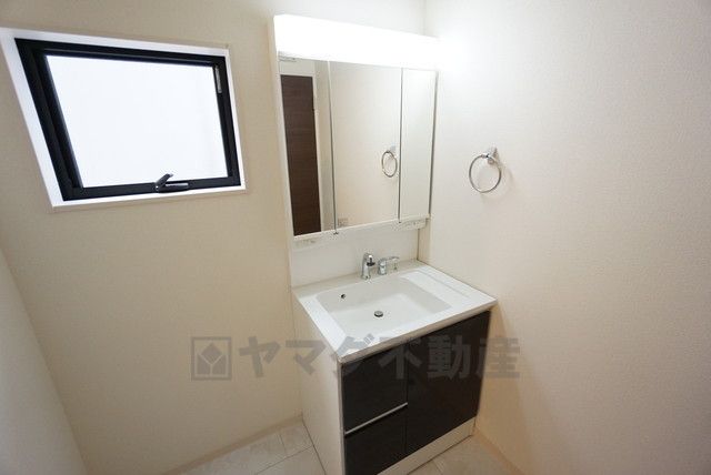 三面鏡裏収納付き洗面化粧台です^^ 歯磨きセットやスキンケア用品などの収納に便利ですね。