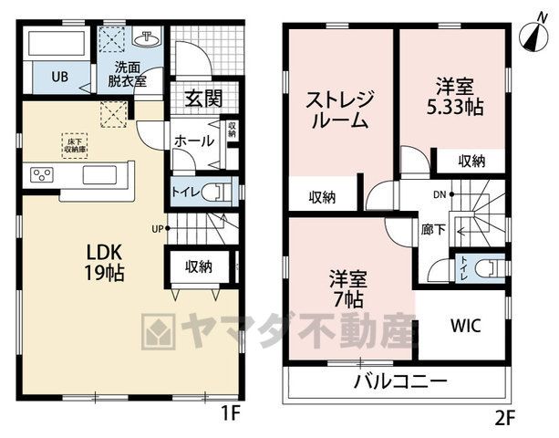 LDK19畳(1F)、洋7畳(2F)、洋5.3畳(2F)、S0畳(2F) |