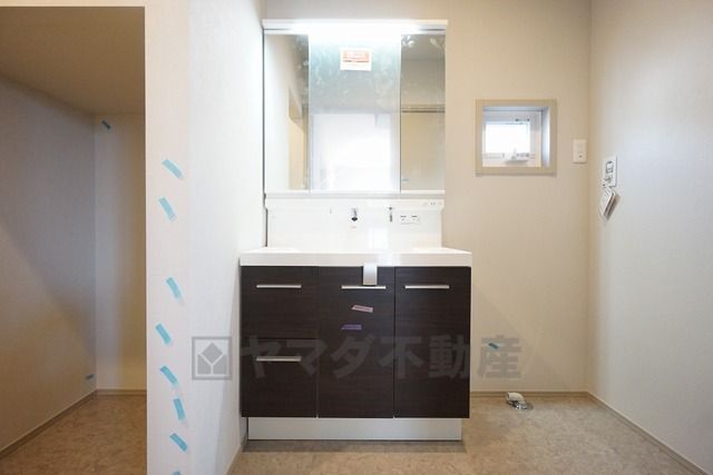 三面鏡裏収納付き洗面化粧台です^^ 歯磨きセットやスキンケア用品などの収納に便利ですね。 ランドリースペース上部には窓も付いており換気に便利です^^