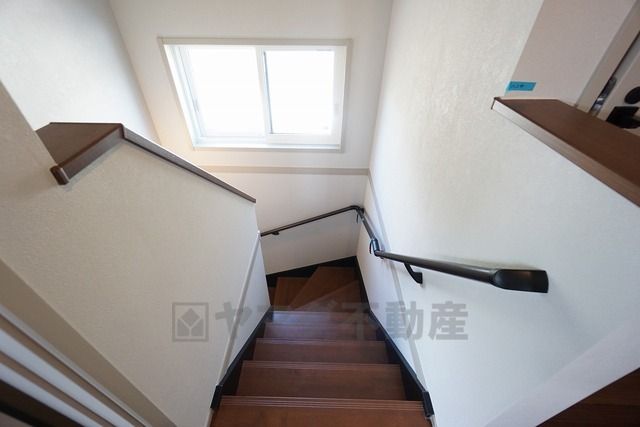 お子様も高齢の方も安心して上り下りができる手摺がついた安心設計です。 階段には小窓を配置しました。日中でも暗くなりがちな階段下が明るくなり安全ですね。
