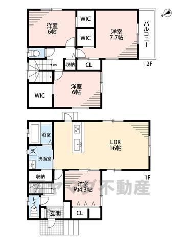 LDK16畳(1F)、洋4.3畳(1F)、洋7.7畳(2F)、洋6畳(2F) |