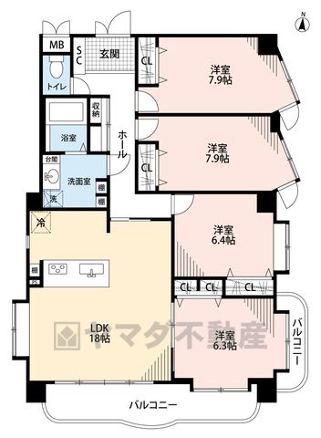 LDK18畳、洋7.9畳、洋6.4畳、洋6.3畳 |