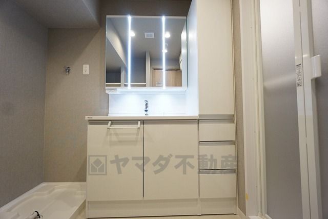 三面鏡にハンドシャワー付きで使いやすい洗面台です^^鏡裏と洗面ボウル下に収納付きの洗面台なので、整理整頓ができスッキリと使えます^^