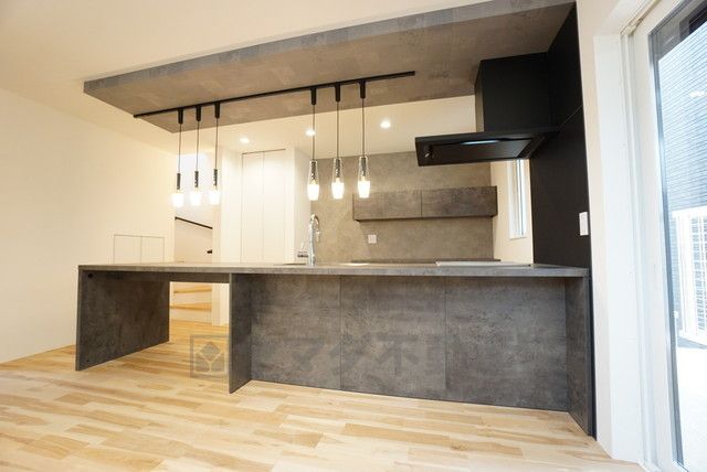 窓から光が差し込む明るいダイニングです^^折下げ天井とアクセントクロスでスタイリッシュなキッチンです^^キッチン後方にはカップボードとパントリーが付いています^^