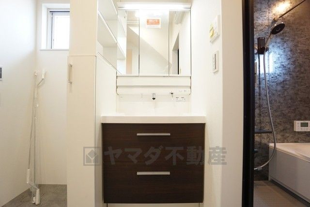 三面鏡にハンドシャワー付きで使いやすい洗面台です^^鏡裏と洗面ボウル下に収納付きの洗面台なので、整理整頓ができスッキリと使えます^^