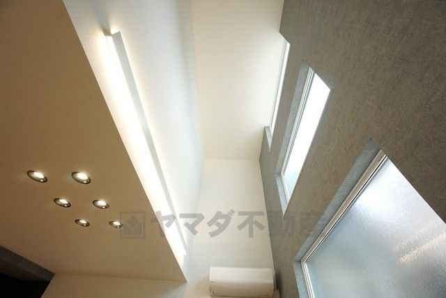 リビング上部は吹抜けとなっています^^天井まで見渡すことが可能であるため視線の抜けが良く、実際の部屋の広さよりも広く感じます^^