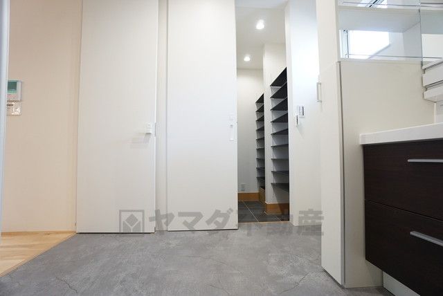 玄関にはシューズクローク付き。ご家族全員分の靴からベビーカーやゴルフバッグなどもしっかり収納できます^^洗面室にも直行できるウォークスルー仕様^^