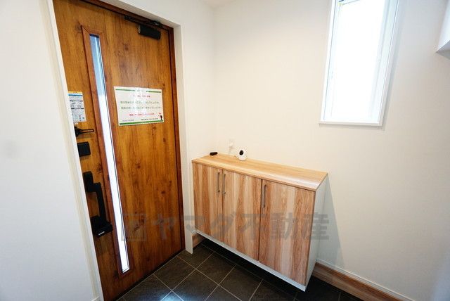 玄関扉にスリットのある明るい玄関です^^たっぷり収納できるシューズボックス付きなので、家族全員の靴がきれいに整頓できます。