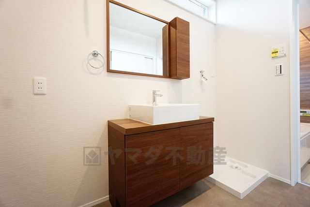 三面鏡裏収納付き洗面化粧台です^^ 歯磨きセットやスキンケア用品などの収納に便利ですね。脱衣スペースも広々と確保されていて嬉しいですね^^