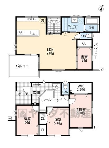 LDK21畳(2F)、その他3畳(2F)、洋6.7畳(1F)、洋6畳(1F)、洋5.4畳(1F) |