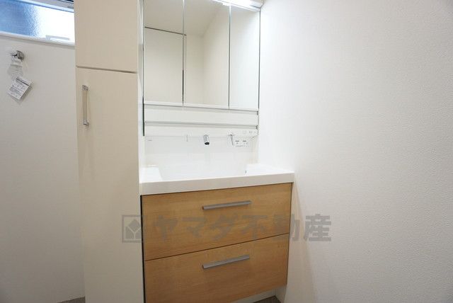 三面鏡にハンドシャワー付きで使いやすい洗面台です^^鏡裏と洗面ボウル下に収納付きの洗面台なので、整理整頓ができスッキリと使えます^^ランドリースペースとの間にもちょっとした収納付きです^^