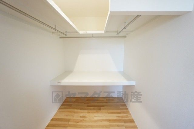 寝室にはウォークインクローゼット付き。ハンガーパイプ下にボックスを置いて、枕棚を活用して、たっぷりと収納できそうです^^