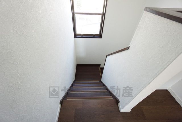 お子様も高齢の方も安心して上り下りができる設計^^階段には小窓を配置しました。日中でも暗くなりがちな階段下が明るくなり安全ですね。