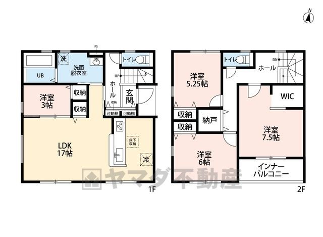 LDK17畳(1F)、洋3畳(1F)、洋7.5畳(2F)、洋6畳(2F)、洋5.2畳(2F)、S0畳 |