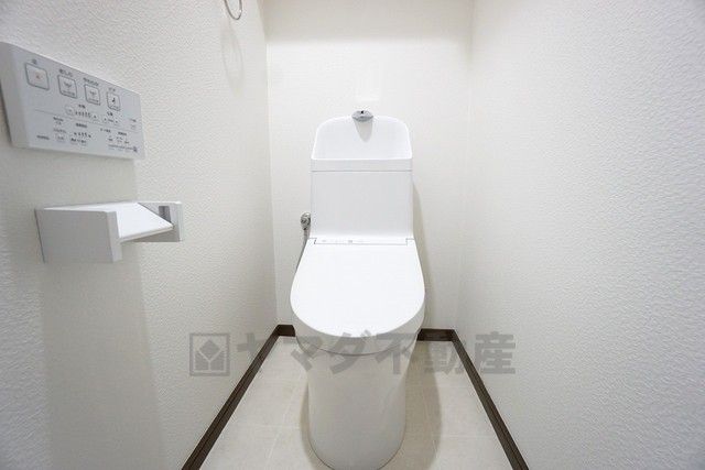 ウォシュレット、暖房便座、節電・節水機能など、使い勝手のよい高機能トイレです。トイレットペーパーの予備などを収納できる棚が付いています。