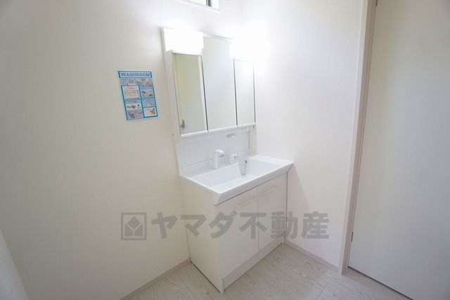 三面鏡裏収納付き洗面化粧台です^^ 歯磨きセットやスキンケア用品などの収納に便利ですね。