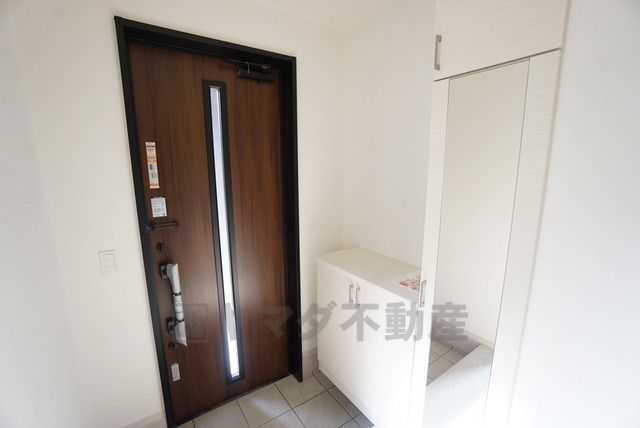 玄関扉にスリットのある明るい玄関です^^シューズボックス付きなので、家族全員の靴がきれいに整頓できます。姿見付きなのでお出かけ前の身だしなみチェックに便利^^