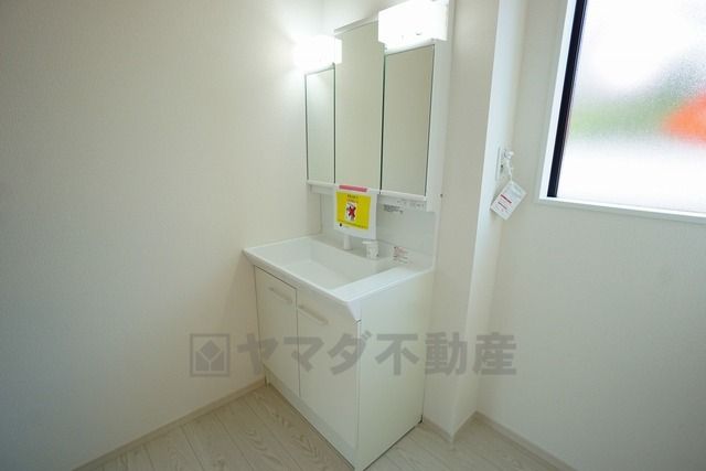 三面鏡つき洗面台^^収納も一体型になっているので、ドライヤーやヘアアイロンの置き場に困りませんね^^