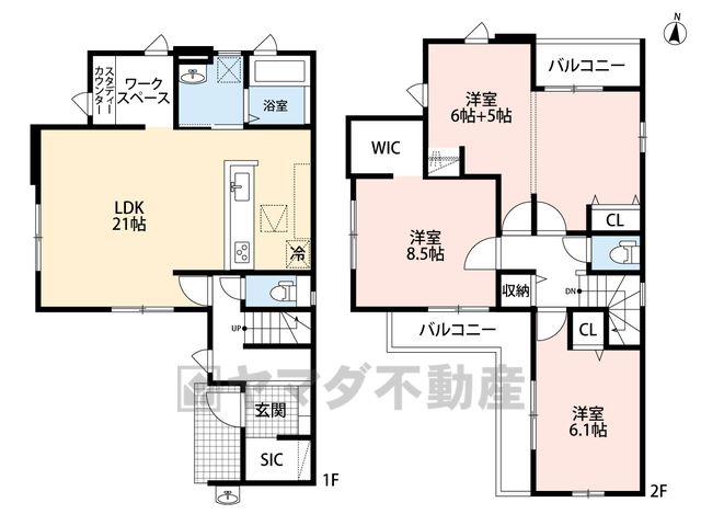 LDK21畳(1F)、洋11畳(2F)、洋8.5畳(2F)、洋6.1畳(2F) |
