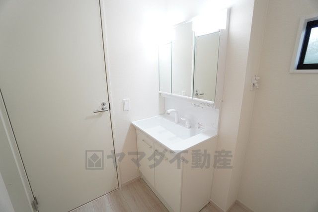 三面鏡裏収納付き洗面化粧台です^^ 歯磨きセットやスキンケア用品などの収納に便利ですね。