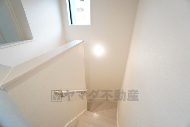 お子様も高齢の方も安心して上り下りができる手摺がついた安心設計です。 階段には小窓を配置しました。日中でも暗くなりがちな階段下が明るくなり安全ですね。