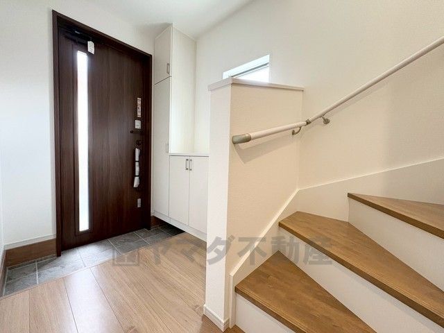 ご年配の方でも安心できる、手すり付き階段です^^段差も低めで設定されてますので安全性にも優れてますね^^