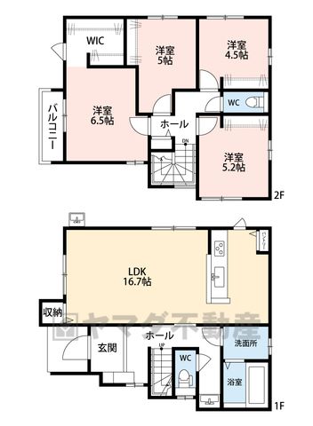 LDK16.7畳(1F)、洋6.5畳(2F)、洋5.2畳(2F)、洋5畳(2F)、洋4.5畳(2F) |