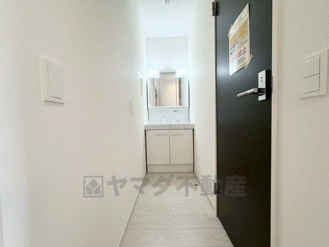三面鏡つき洗面台。収納も一体型になっているので、ドライヤーやヘアアイロンの置き場に困りませんね^^