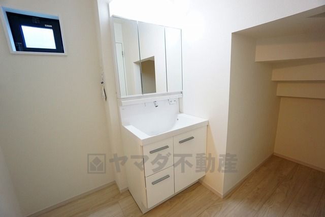 三面鏡つき洗面台。収納も一体型になっているので、ドライヤーやヘアアイロンの置き場に困りませんね。落ち着いたホワイトトーンの扉なので、観葉植物を置いてもおしゃれですね^^
