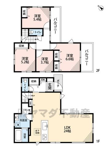 LDK24畳(1F)、洋6.6畳(2F)、洋5.4畳(2F)、洋5.2畳(2F)、洋3.7畳(2F) |