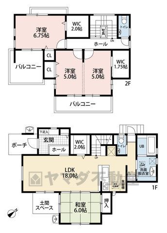 LDK18畳(1F)、和6畳(1F)、洋6.7畳(2F)、洋5畳(2F) |