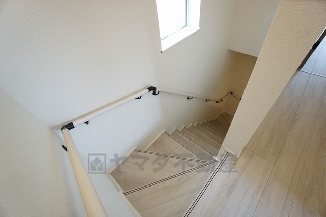 お子様も高齢の方も安心して上り下りができる手摺がついた安心設計です。 階段には小窓を配置しました。日中でも暗くなりがちな階段下が明るくなり安全ですね。