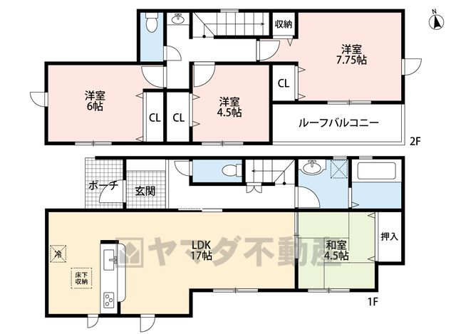 LDK17畳(1F)、和4.5畳(1F)、洋7.7畳(2F)、洋6畳(2F)、洋4.5畳(2F) |